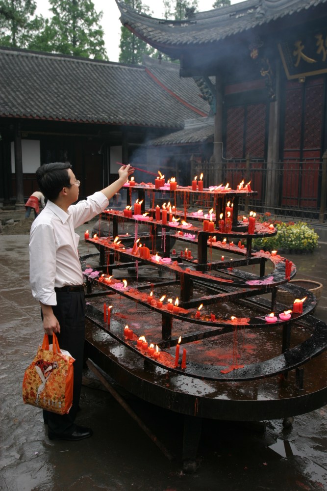‘wenshutempe05lmancandels’ Mannen med handlebagen, formiddagsbesøk i Wenshu tempel , Cjhengdu by, Sichuan provinsen.